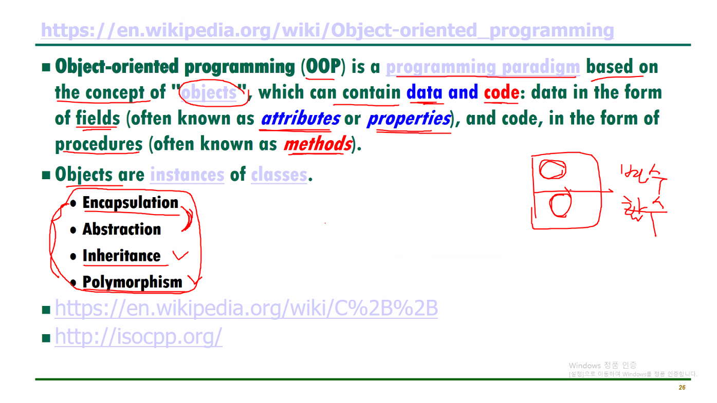 클래스는 캡슐화시키는도구인데, 그안에는 자료와 함수가 같이 들어가있다.