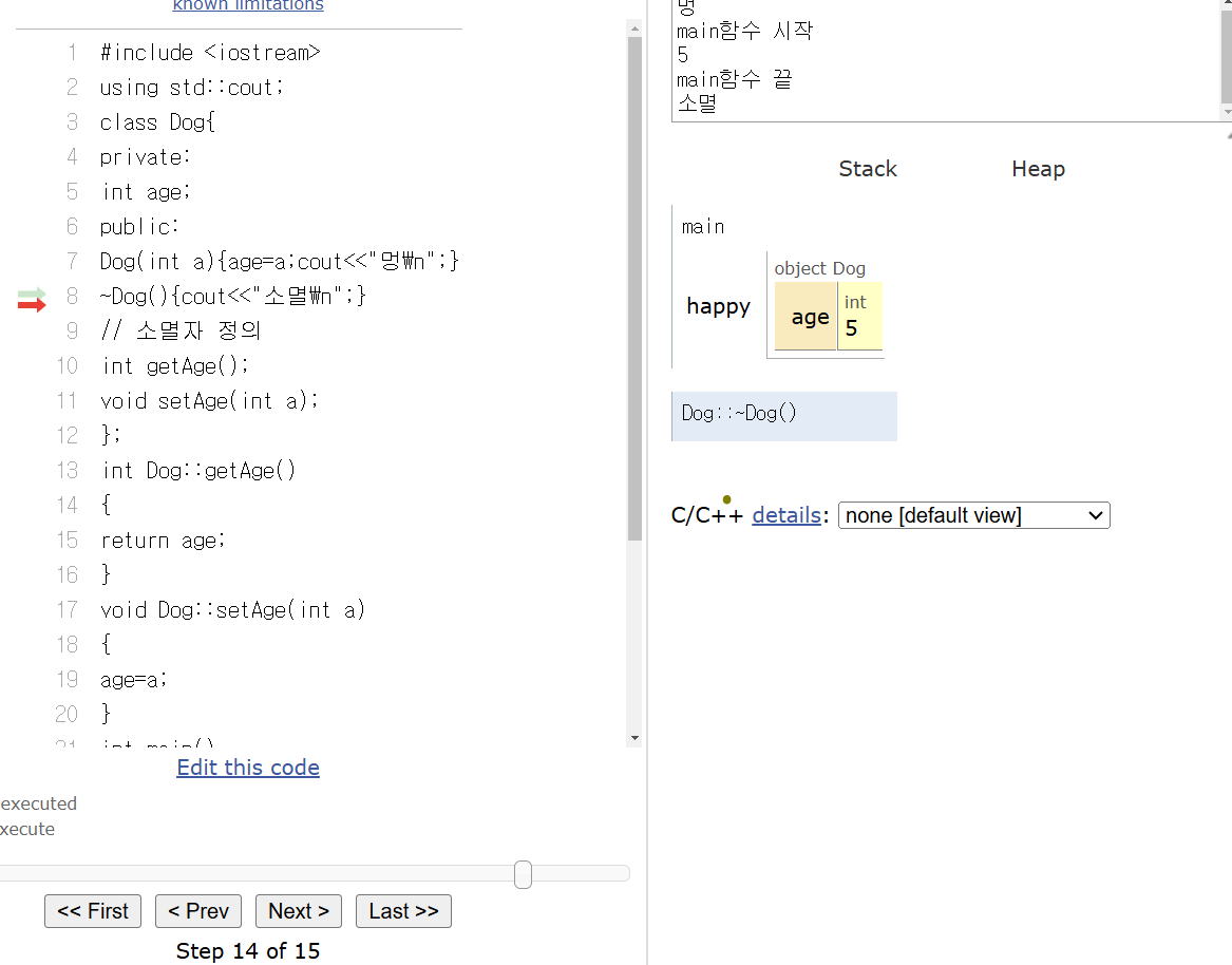 예시: ~Dog() 소멸자는 객체가 소멸될 때 메시지를 출력합니다. C++에서는 소멸자가 자동으로 호출됩니다.