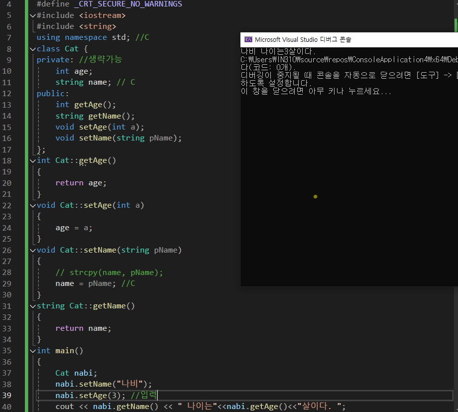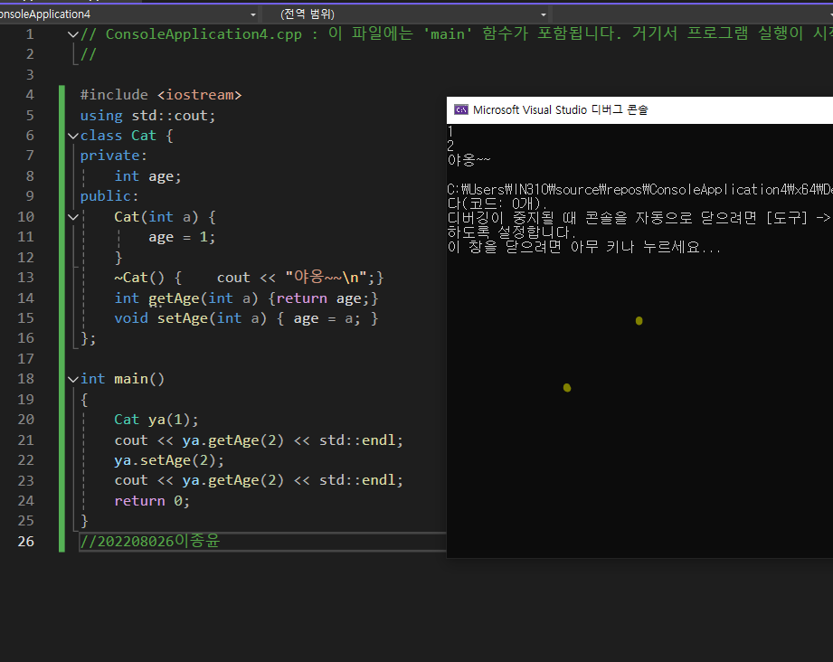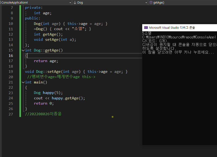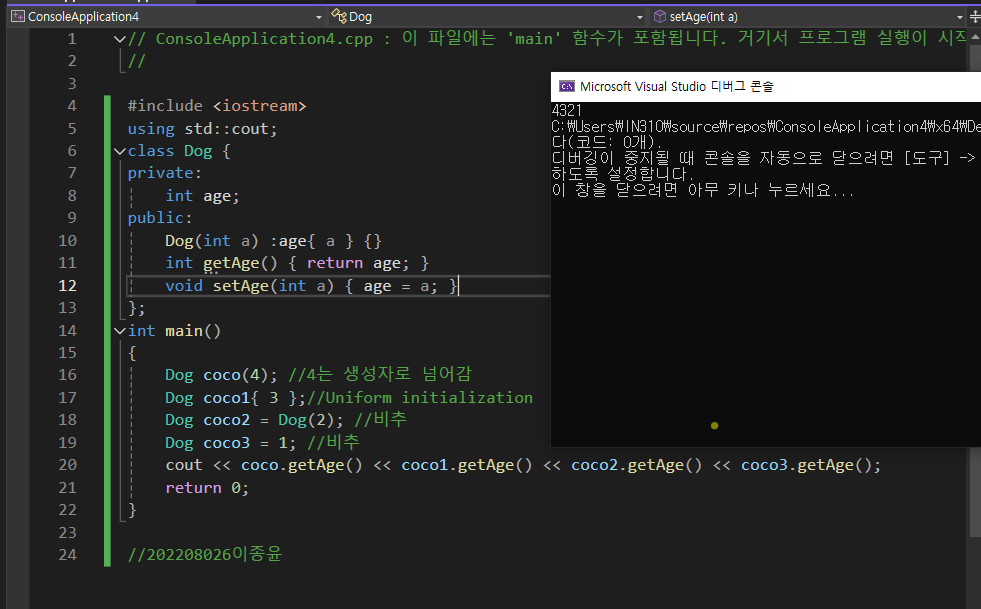 13번째줄에서 생성자로 넘어가서 나이를 한살로 바꾼다.