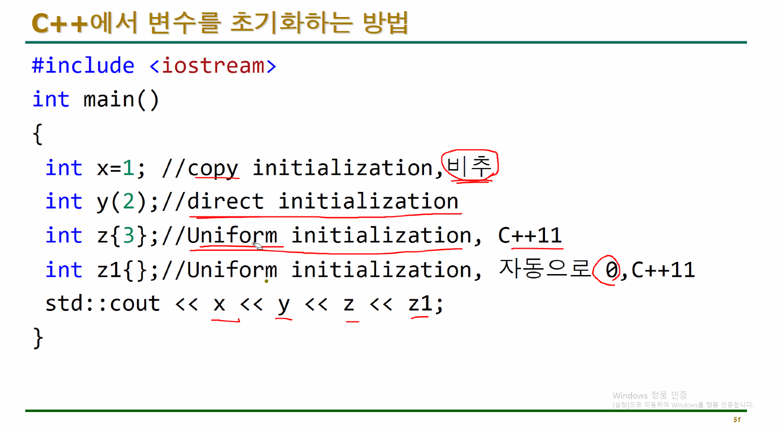 세 번째 방법은 C++11 이후에 도입된 문법으로, 더 안전하고 직관적인 초기화를 제공합니다.