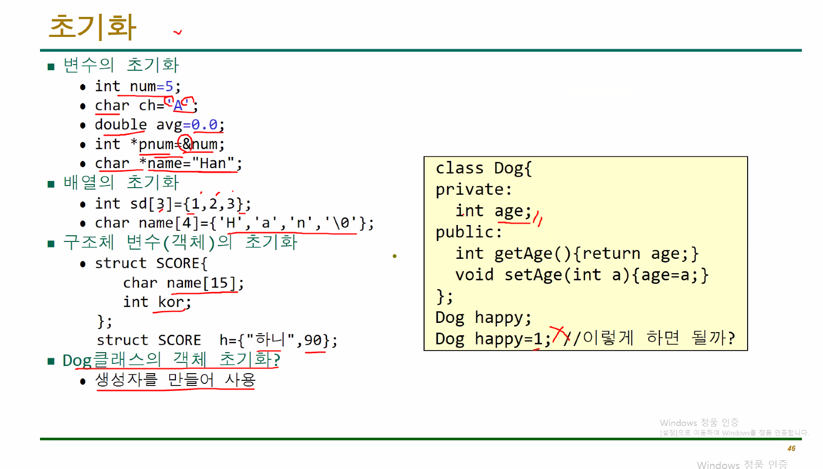 Dog() : age(1) { // 초기화 리스트를 사용하여 age를 1로 초기화