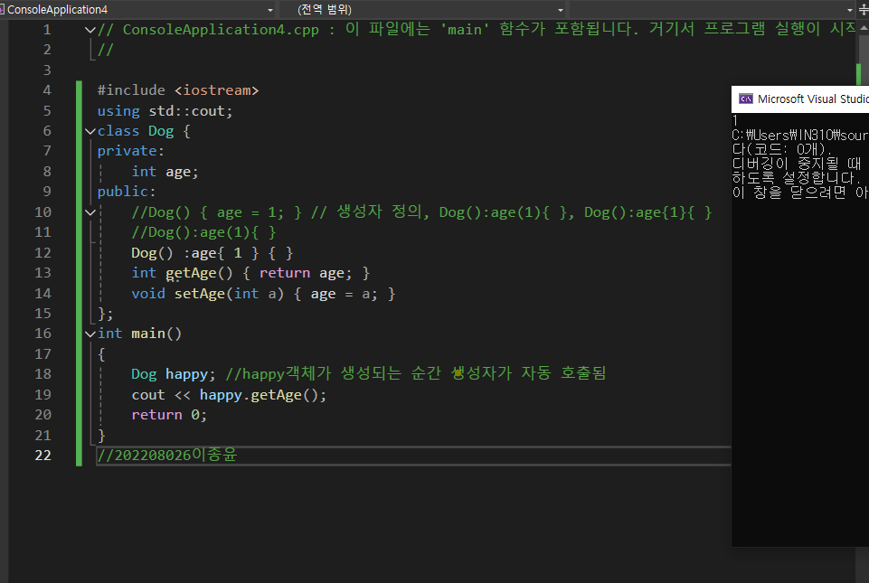 이 생성자는 초기화 리스트를 사용하여 age 멤버 변수를 1로 초기화합니다. 초기화 리스트를 사용하면 멤버 변수를 생성할 때 직접 값을 지정할 수 있어 성능이 더 좋습니다.