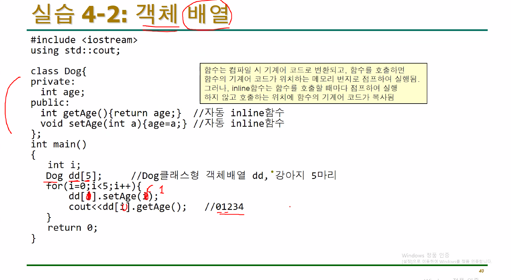 예시: Dog(string n) 생성자는 name 멤버 변수를 인자로 받아 초기화합니다. 생성자 내부에서 객체가 생성되었다는 메시지를 출력합니다.